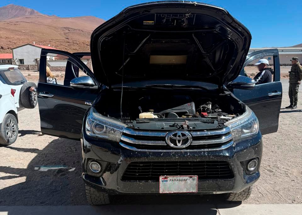 camioneta Toyota Hilux negra, de nacionalidad paraguaya, ocupada por dos hombres paraguayos en tránsito hacia Chile.