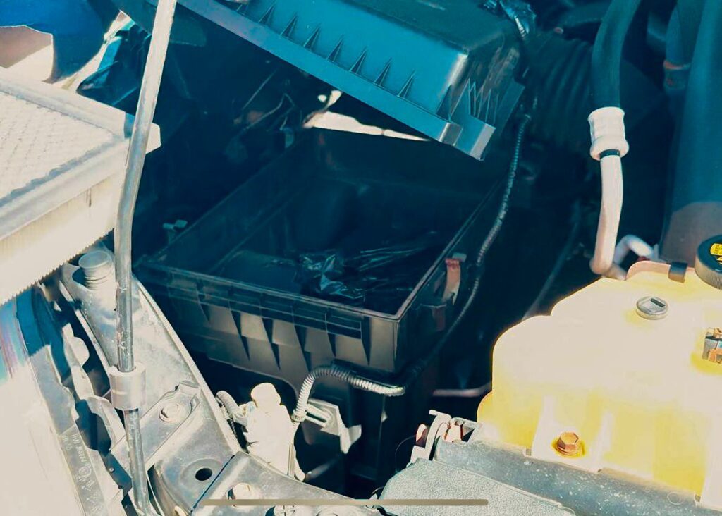 Durante la entrevista, el conductor declaró transportar USD 7.800 y su acompañante USD 6.800, por lo que se dispuso la inspección del vehículo. Al revisar el compartimiento del filtro de aire, se detectaron signos de manipulación y un paquete negro oculto. Se dio intervención inmediata a la