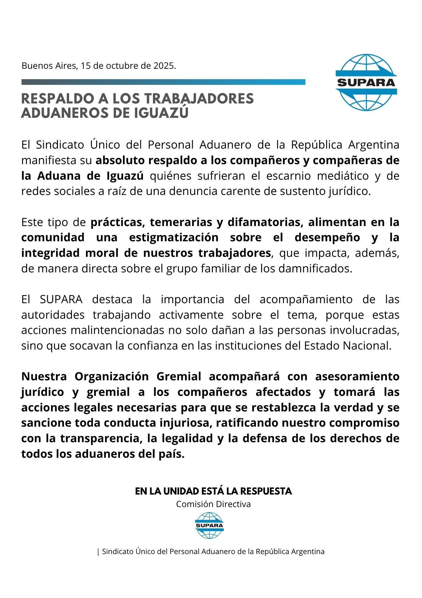 Comunicados RESPALDO A LOS TRABAJADORES ADUANEROS DE IGUAZÚ Posted on 15/10/2025 Author Prensa Comentarios desactivados en RESPALDO A LOS TRABAJADORES ADUANEROS DE IGUAZÚ Descarga el Comunicado de Prensa