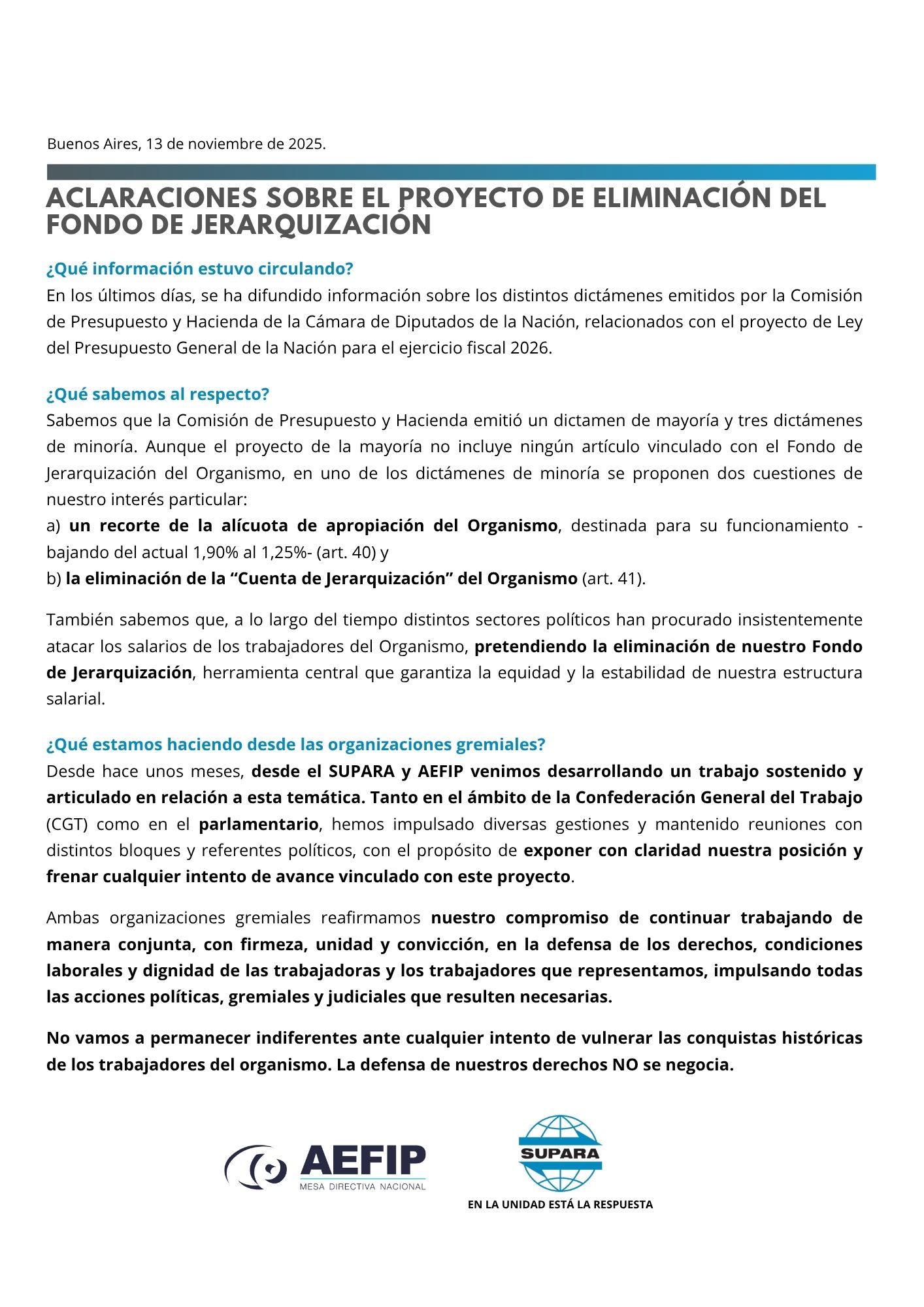 Comunicados ACLARACIONES SOBRE EL PROYECTO DE ELIMINACIÓN DEL FONDO DE JERARQUIZACIÓN Posted on 13/11/202513/11/2025 Author Prensa Comentarios desactivados en ACLARACIONES SOBRE EL PROYECTO DE ELIMINACIÓN DEL FONDO DE JERARQUIZACIÓN Descarga el Comunicado de Prensa Conjunto