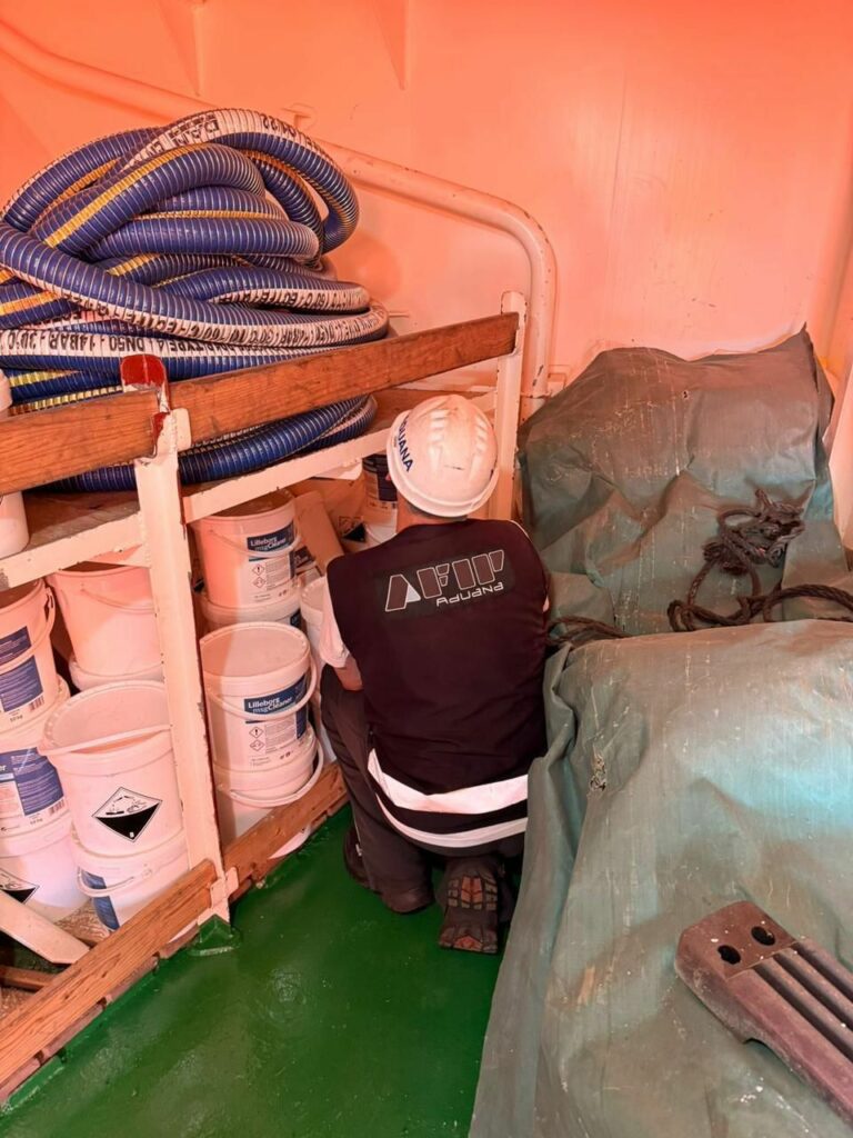 Durante el control se detectaron faltantes de 1.100 litros de pintura marina y 6.500 litros de lubricantes respecto a lo declarado, configurando una presunta infracción al Código Aduanero, con un valor estimado de $80.000.000.